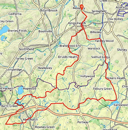 This is the loop I most often use from home to keep fit between cycling club rides. It is deliberately hilly to give some hill climbing experience. On the way out it’s fairly fast to Alvechurch but then there is a steady climb up Cobley Hill. A quick descent of Aqueduct Lane and loop between the Bittell Reservoirs is followed by a cautious crossing of the A441, Birmingham-Redditch Road, and then a pull up Forehill with its nasty top kick. The return to the built-up area is achieved by riding through Druids Heath and Brandwood End.