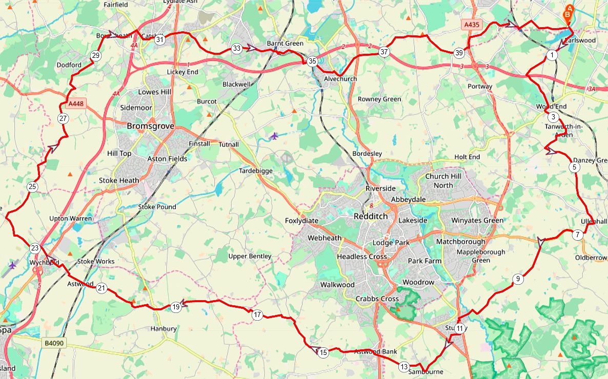 Turning left and then right through Sambourne the route rises to Astwood Bank, straight across the A441 at the traffic lights and steeply downhill to a dangerous right turn off the main road before taking quiet lanes to Ham Green and up Cruise Hill where the lane follows the ridge with open views on both sides. At the foot of the ridge the route turns right and follows through to the craft centre at Hanbury. The route now skirts round keeping clear Bromsgrove, through Wychbold and up to Dodford, eventually arriving at Bourneheath and the Nailers Arms.