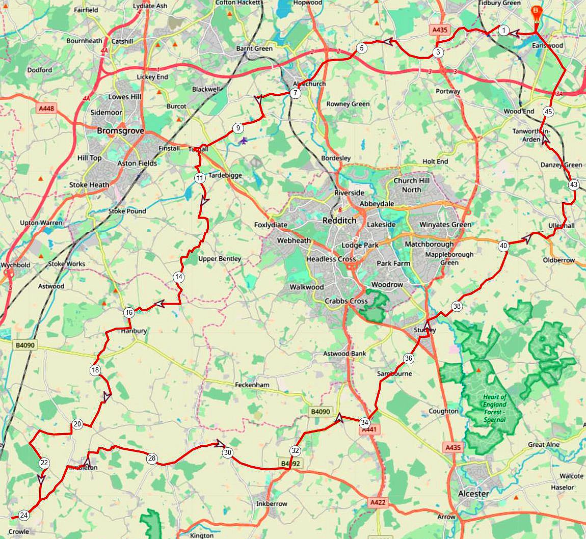 I used a route I follow regularly from Earlswood out to Alvechurch and then up Cobley Hill before dropping down to Tunstall to cross the main Bromsgrove to Redditch road. Sticking to small roads the route winds south between Upper and Lower Bentley to the Jinny Ring Craft Centre. Continuing south west past Hanbury, across the Saltway and on to Broughton Green. At Shell the route turns west towards Saleway before turning south again through Sale Green and on to Crowle Green.
