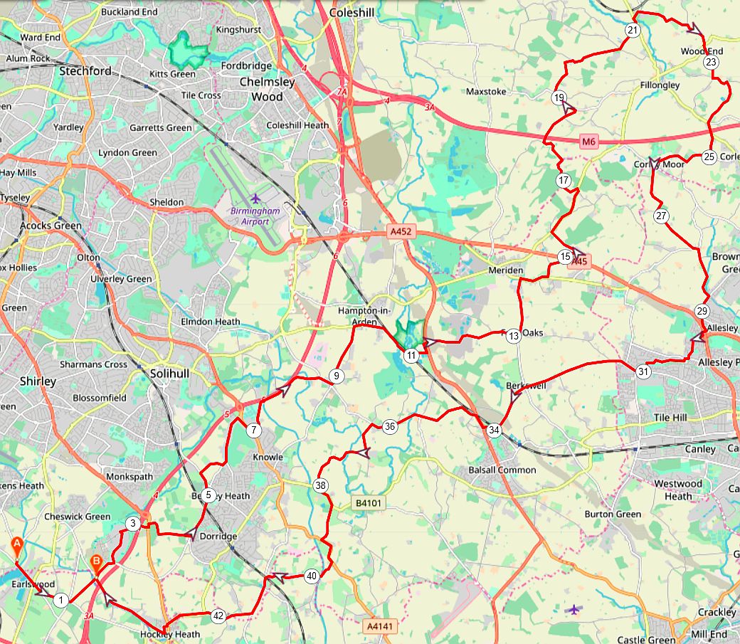 The route then follows lanes downhill to Allesley where it follows a footpath through the busy roundabout at the junction of the A45 and Pickford Way. Thence through Eastern Green and straight on for Berkswell and up to the railway bridge and round two roundabouts onto A452 Kenilworth Road for a short distance before turning off left onto Wootton Lane and up to Barston. Turning south the route uses more lanes to avoid Dorridge before heading into Hockley Heath. Finally the route follows School Road to Wedges Bakery, but alternatively those familiar with Hockley Heath could find their way onto Cut Throat Lane directly to Earlswood.