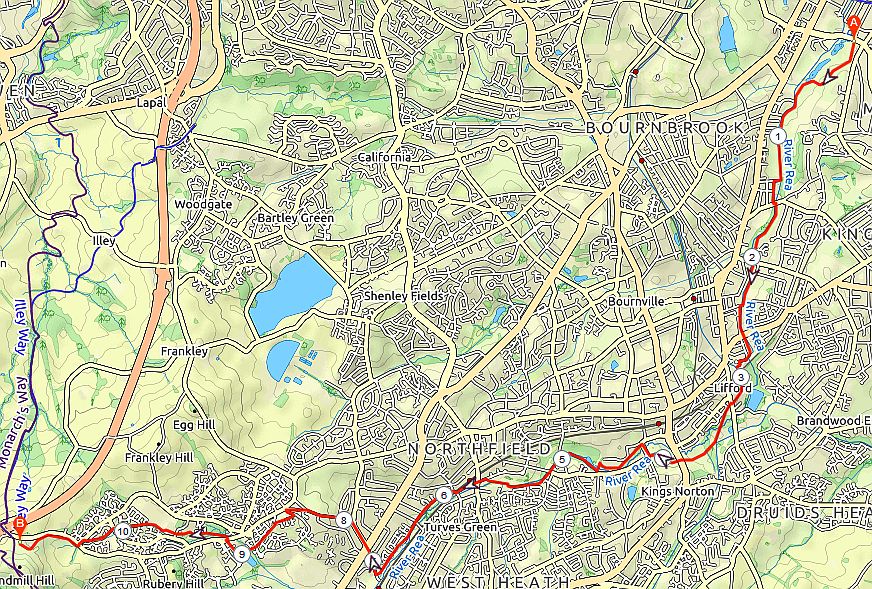 This is an off-road route along the River Rea Valley from Cannon Hill Park to Waseley Hills Country Park where the River Rea rises. Actually it’s more of a brook than a river, but never mind. The route is hard paved for nearly all its length, with the odd section of hard shale, but with no muddy grass. Basically follow the Sustrans Route 5 blue signs, being careful not to lose the track where footpaths split. The route leaves River Rea in order to get across the Bristol Road south of Northfield, but then finds its way back to the source of the river at Waseley Hills. There is a greasy spoon café at country park but during the Coronavirus lockdown this is not open, so take your own sandwiches!