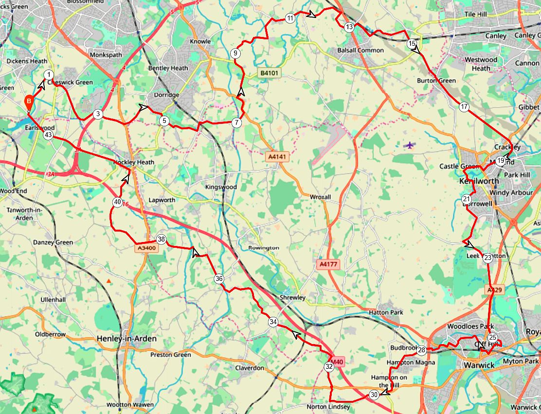 This is an south easterly ride taking in the Kenilworth greenway and an interesting southerly dip into Warwick to a super pub with a micro brewery. Food was a little sparse but the beer made up for that. I only found the pub by accident, having invited a friend to try the route with me that had intended to visit another pub, but he whooped with excitement as passed The Wild Boar and so I popped in to check if they did food and made a provisional booking for a club ride.