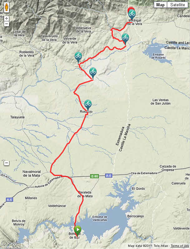 This was the last flat day for a while before I hit the Sierra ed Gredos. At times I could see the Sierra tipped with snow in the far distance. I set off from my cold water hotel (after desayuno in the bar) and immediately crossed the Embalse de Valdecañas that the Rio Tajo flows through on its way to form the southern border between Spain and Portugal. My camera was working again having cooled down in my bar-bag. North of the Rio Tajo is the valley of the Rio Tietar that flows into the Rio Tajo a few kilometres to the West and riding across this was absolutely fabulous. I passed storks on top of ruins and after Navalmoral took a small road towards Rosalejo that shot like an arrow towards the Rio Tietar.