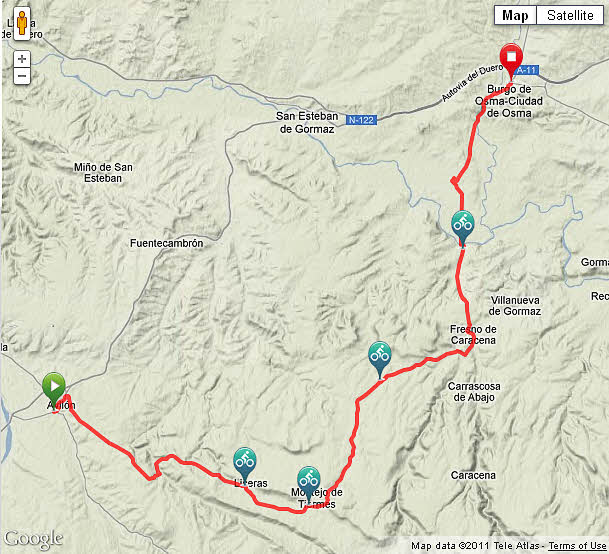 I was cycling up the N-110 that joins the N-122 and then becomes the A-11 Autovia (motorway) to Soria. I could see from my map that the N-122 effectively disappears for about 10 kilometres round El Burgo and was hoping that the road builders had left something for non-motorway vehicles to use. In fact there was nothing official at all, except the remains of the old N-122 to the right of the new carriageway. There was no way for a car to get onto the old road but I managed to scramble across the muddy ground and rode along the old tarmac avoiding potholes and mounds of rubble. I rejoined a proper road where a slip road left the A-11 heading for El Burgo.
