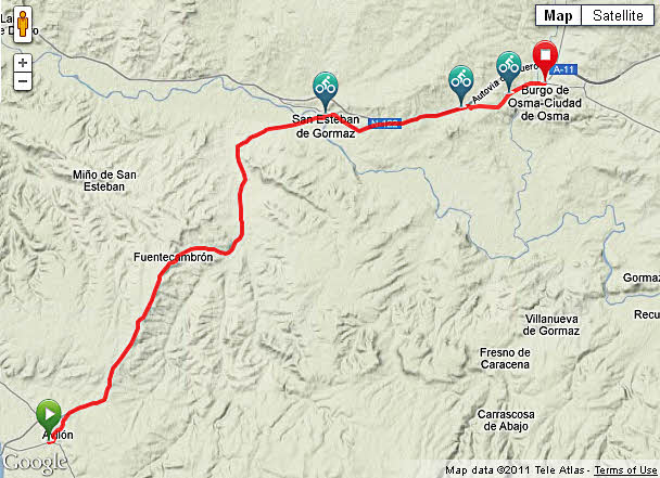 The city has industrial outskirts that looked decidedly depressing as I rode through them, but I perked up where the approach road crosses the Rio Ucero and I stopped to take a photograph of the cathedral and old city walls. My map showed a campsite in the vicinity but I could see no signs of one and my enquiries got nowhere. I came across three hotels at a junction. One looked expensive, one looked closed and the other didn't look like a hotel, but it did have the word Hospederia over its door that might have meant that it was a hostal or small hotel, but the word wasn't in my phrase book. It turned out to be a super small hotel that welcomed my bicycle and tucked it up down a cosy corridor. I asked if there was a campsite nearby and was told that there was but it was 17 kilometres to the North, I think at Ucero, but by then I had paid for my room. I suppose it would have been more in the spirit of the journey to have cycled up what looks like an attractive river valley (Michelin marks it as a scenic route); another missed opportunity!