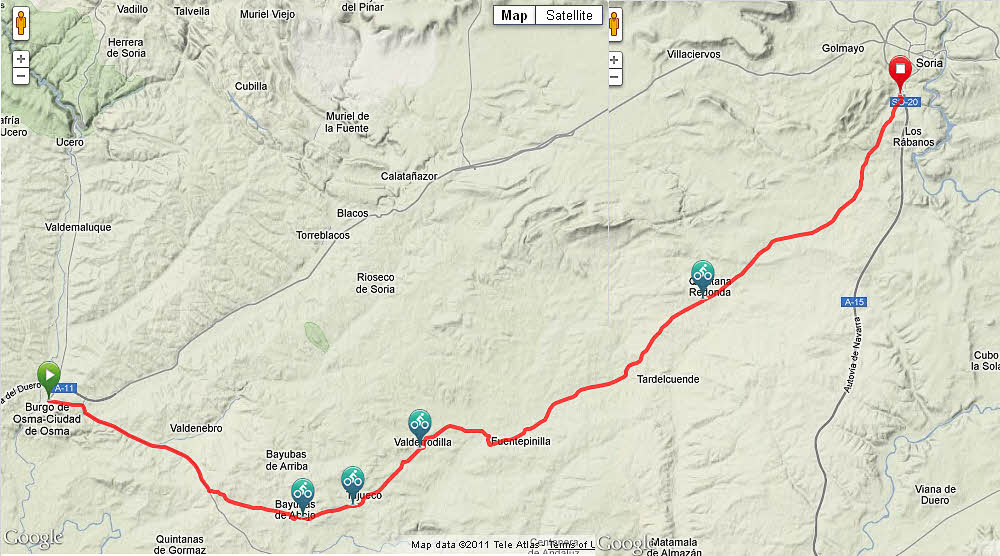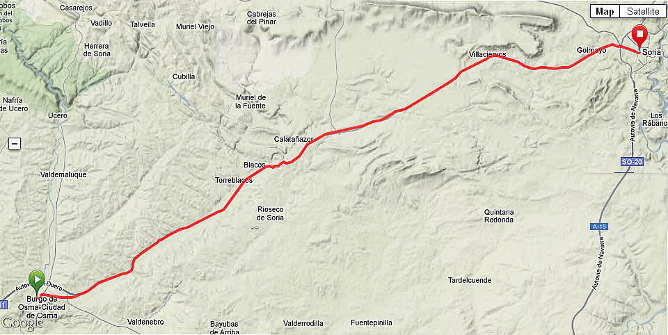 I have shown both routes and the original would have been entirely practical, except for the entry to Soria from the South that Google Maps shows to be only possible along a motorway. On the other hand I anticipate that I would have been able to find a route through. The fascinating thing is that on Google Street View I have found the camp site that I should have stayed at. It is almost exactly at the point where my Southern route comes to an end, just under a railway bridge. At that point the road becomes a one way road in the wrong direction, so I couldn't have proceeded, but just there on the left is Camping Fuente de la Teja. There is a road sign half a mile up the road that I would have seen. Just think…