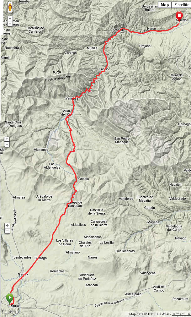 I got away from Soria at about ten o’clock and got to Arnedo at about five o’clock. I had a second breakfast at Garray, and pushed on up the steady inexorable climb to the Puerto de Oncala. Riding was good and I got to the top without too much difficulty having stopped at regular intervals for water and nibbles, at one point in a bus shelter. The riding just got better as I rode down the other side along a wide valley towards Villar del Rio. Lunch was becoming a missed opportunity as I had not seen anything resembling a bar or a restaurant since half past one, when restaurants in Spain tend to open, when I came across a restaurant tucked just off the side of the road as I was leaving Yanguas. Gratefully I screeched to a halt and propped my bicycle up in a small courtyard and went into the deserted restaurant. The man there cooked me a meal from scratch and very good it was.