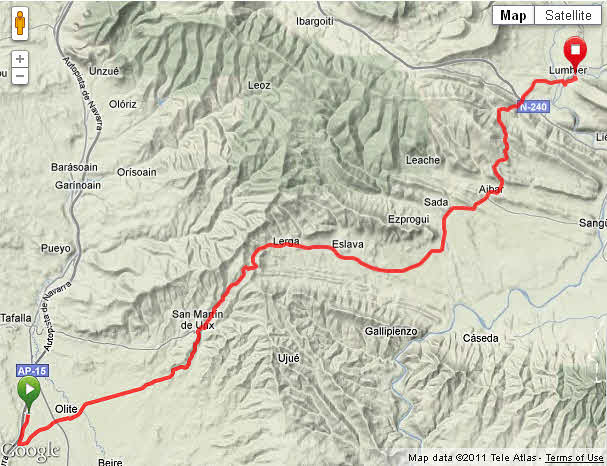 At Aibar I came to the only bar on the route and had a bocodillo caliente (hot bacon sandwich). From Aibar the road climbs to Puerto Olaz through another interminable succession of gentle curves, each one giving every indication of being the top until you round the corner and see the road stretching out again for another quarter mile. As I neared Lumbier I came to a welcome camp site sign and followed it round the back of the town to Camping Iturbero, quite one of the most delightful sites on the whole journey. I had supper in the bar and went to bed happy.