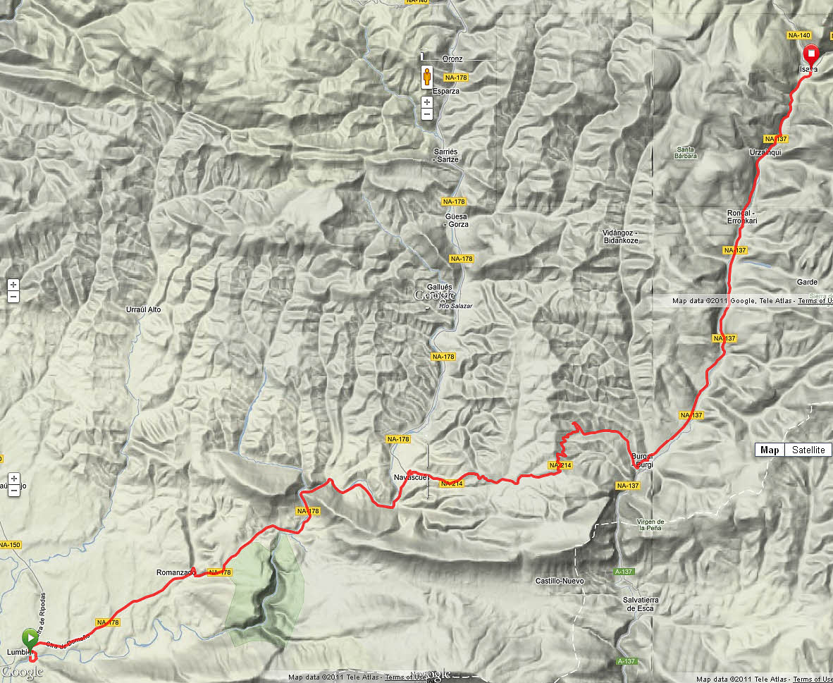 I went back into Lumbier and had breakfast in a very good panaderia. I found a supermarcado and bought provisions for the day and set off into the foothills of the Pyrenees. I got over the Alto de Iso without getting off, which was encouraging. The road was good with a really smooth surface but went on and on twisting round endless spurs and ridges. Just past the Alto de Iso there is a new stretch of road that cuts off a series of hairpins round the top of the Hoz de Arbayun and I was tempted to leave the new road, but didn’t in favour of easy riding.