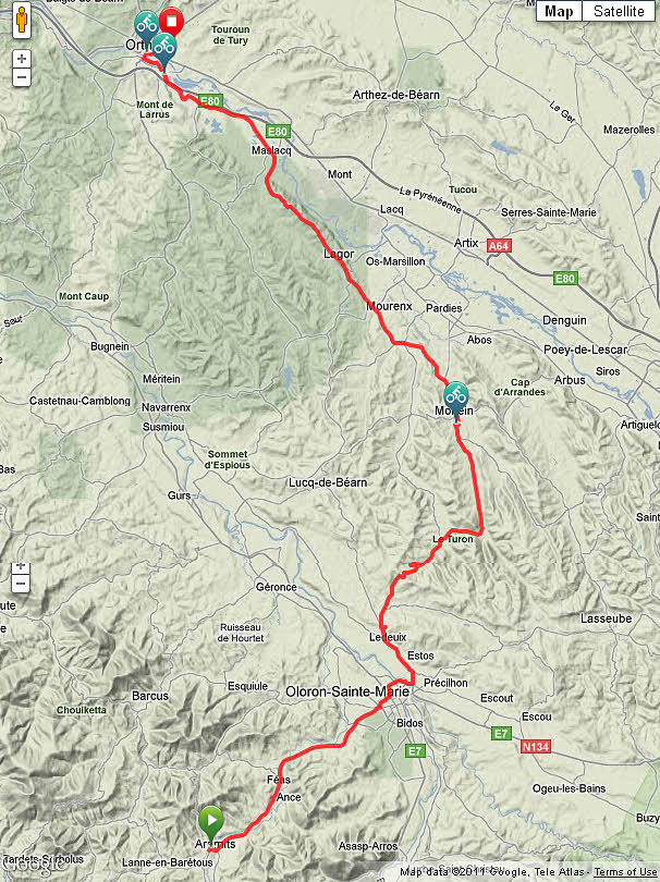In the morning there was a heavy dew and my washing was not remotely dry as I was on the wrong side of a tree and the early morning sun had not reached me by the time I left, so I had to festoon my panniers and let it all flap in the breeze as I rode along. Having dropped to a lower altitude there was no cooling breeze and the sun was hot. I arrived in Monein at one o'clock and asked a couple of children for the nearest restaurant and they pointed uphill to the town square where there was a restaurant heaving with a mixture of working people and families. The waiter spotted me and addressed me in English asking whether I wanted the à la carte or the menu du jour. I chose the latter and a three course meal arrived without further questioning. That meal was the best bar one of all the meals I'd had in Spain.