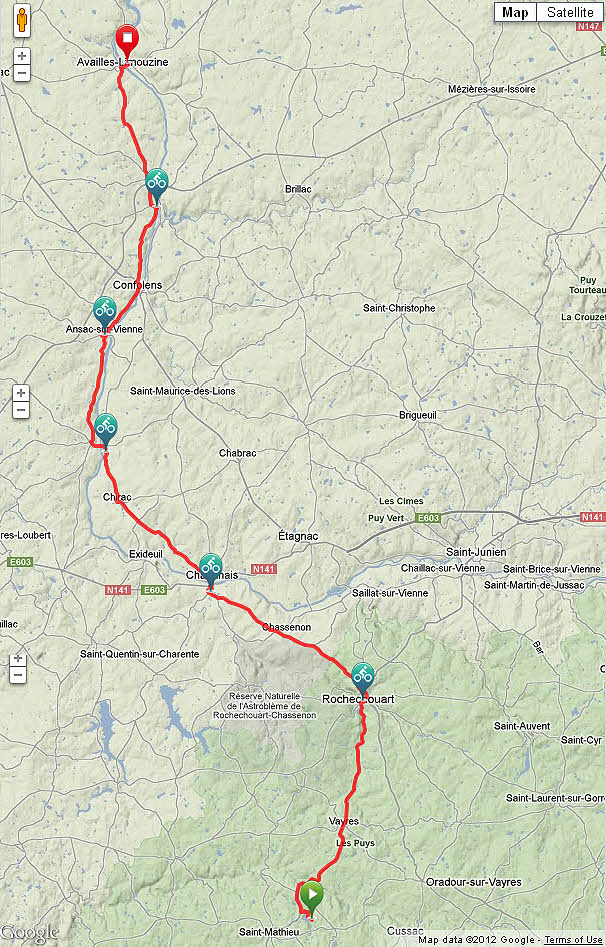The night was clear with brilliant stars and consequently it was cold. I was gradually getting into northern Europe and the nights of lying on top of my sleeping bag in Spain seemed a long way off. I set out in weak sunshine into a northerly wind and kept my cycling jacket on most of the day as a windproof. I didn't return to St Mathieu but found my way round the lake to the D675 to Rochechouart with its chateaux sitting high above the road. From there I took the D54 that changes to the D29 across the border from Dordogne to Charante towards Chabanais where I crossed the river.