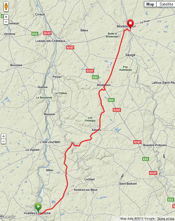 I rode back to the ‘T’ junction, stopping to take a photograph where a footpath crosses the road and a small brook. I carried on along the D729 to Adriers, crossing a number of small streams in steep little valleys. Just after leaving Adriers I had stopped to check my map when two other cyclists passed me and stopped for a chat. They were looking for a campsite, and I told them I was heading for Montmorillon where I was pretty sure there was a municipal site, so we set off together, and covered the remaining 20 kilometres through Moulismes quite quickly, taking it in turns to set the pace. In Montmorillon we all stopped to ask a passing lady for directions, and I realised just how poor my French was as I listened to my companions chat with her fluently. There were signs for the campsite across the River Gartempe and we were charged the smallest amount of any site I had been to so far, possibly only €3 each, but my memory has faded. The showers were hot and I hung my washing from a tree next to my tent before we all rode into Montmorillon for a supper of mussels.
