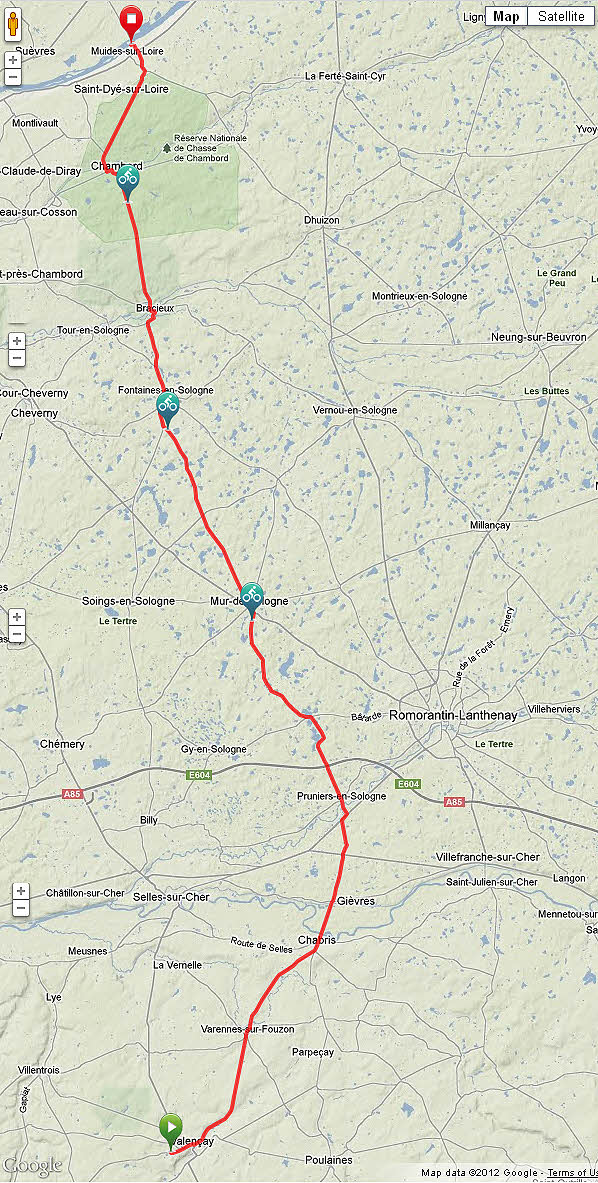 The day dawned with clouds and bright periods after a warm night. I was up at seven o'clock and after packing up rode into Valençay for bread and cheese for the day. My memories of the morning have largely faded away, but I remember stopping for coffee somewhere and met an English lady who used to live in Gibraltar, was brought up in Solihull, had bought a house in France and moved out permanently. Later I came into Mur-de-Sologne where there was a town fête. I stopped at a restaurant and sat under an umbrella on a street-side terrace and had a splendid Sunday lunch. My credit card was not accepted for some reason and I was not allowed to offer an alternative card but had to pay in cash. As I ate a procession of veteran cars drove past all honking their horns.
