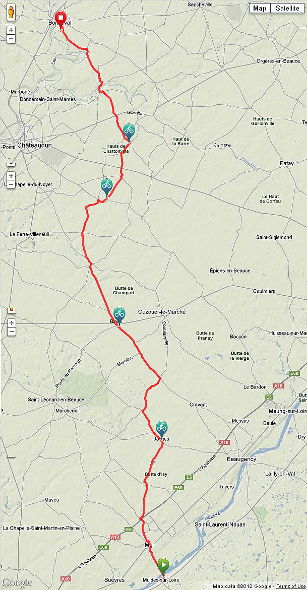 I stopped at Binas for lunch in a comfortable restaurant set back from the road with an attractive red name board. My credit card failed for the second day running but I was able to use my other one so I did not have to use cash like yesterday. From Binas I rode to Verdes and then Le Mée following the D144. After Le Mée the D144 split into fragments all given fractional numbers: D144.4, D144.5 etc. I passed a working windmill on the D144.6; there was nothing to lean my bicycle on so I stood astride it to take a photograph. I have found the windmill on Google Street View and wonder now why I was following such a tortuous route.