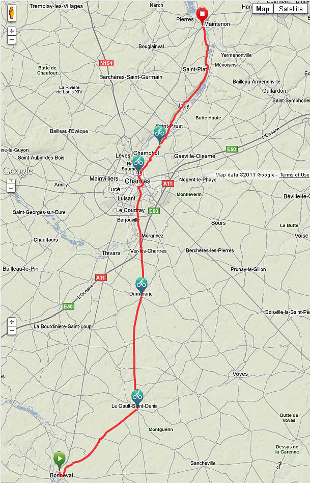 By the outskirts of Chartres my cycling gloves were a soggy mess so I stopped in a bus shelter and rung them out, cycling on with bare hands. Extraordinarily I have found the bus shelter on Google Street View, on the D935 just before it goes under a railway bridge. I followed the road signs to the cathedral, and passed by without stopping. It was shrouded in cloud from the apex of the roof upwards, the spires disappearing from view into the cloud. The thought of leaving my bicycle in the rain while I sat soggy and cold in a restaurant for an hour and then paddling round the cathedral was too dispiriting.
