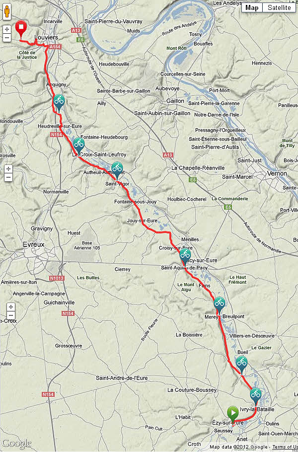 I crossed the river and rode through Ivry-la-Bataille. As I came out of the town there was the only stretch of bicycle track that I found on the whole journey. I followed it to Garenne-sur-Eure, where it disappeared. From there I stayed on the D71 all the way to Louviers, riding along the west bank of the Eure towards its confluence with the Seine. The by-road through river-side villages had a pretty rotten surface with constant badly filled potholes and trenches with road metalwork making for a rough ride.