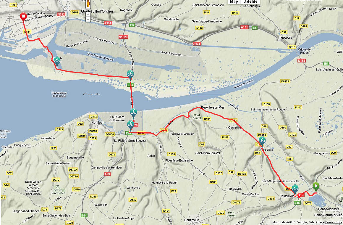 I was up at six o’clock and away by seven as I wanted to be at the port as early as possible to give me the best chance of catching the ferry to England. The road from the campsite was not actually on my map, so I trusted my nose and headed round the lake hoping that it would link up near Toutainville. It went under the A13 autoroute and then into the village where I stopped for a first coffee and croissant. I chose to take the D312, as small road leading round to the estuary and likely to give good views of the Pont de Normandie. It was a little hilly and the weather was overcast, so I stopped again for another coffee and croissant at Foulbec.