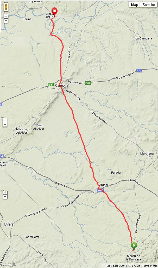 I had desayuno in the bar and recovered my passport. A chap in the bar produced a tourist map of Moron and I used that to find my way out of town, and steadily down hill for about 10 miles to Arahal and then across a 15 mile pancake flat plain until I hit Carmona at the top of its ridge. Ooff! At the top was an impregnable walled city swarming with smart cars and trendy people. I wheeled my bicycle through an enormous medieval double gate and was immediately beckoned into a restaurant by a waiter with an impressive way of flourishing cutlery. €10 for a really filling meal and use of the facilities. I just caught the tourist office before it closed and got a free street map that enabled me to get out of the city without trouble.