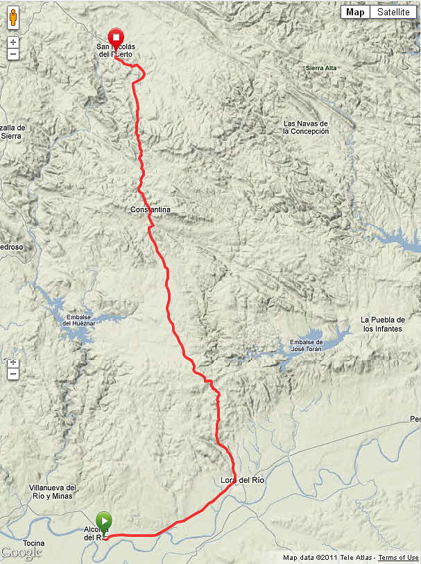 I came down to the bar for desayuno and the barman waved away my profer of payment so breakfast was free. Let's hear it for the truck stop at Alcolea! Suitably sustained I set off for Lora del Rio along the dead flat A436 following the big river. I had originally intended to go North East up the SE6100 and probably it would have been a more attractive route, and not all that more hilly, but I wimped out. At Lora I left the main road and went in search of a bank. I asked a lady for directions and she pointed me up a side street, which I followed only to get lost, and came out of a side road only to bump into the same lady again. She looked a bit exasperated and set me on the right track again. A functioning hole-in-the-wall dispensed lots of nice cash. I found a large supermarket and stocked up with bananas and other essential supplies for the road.