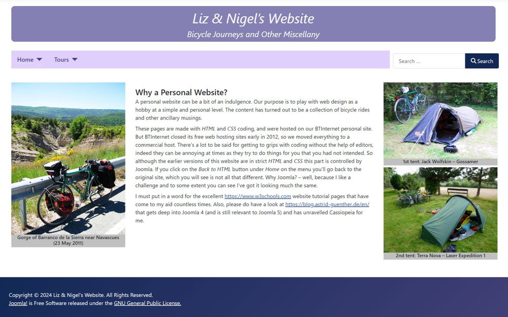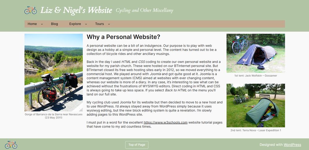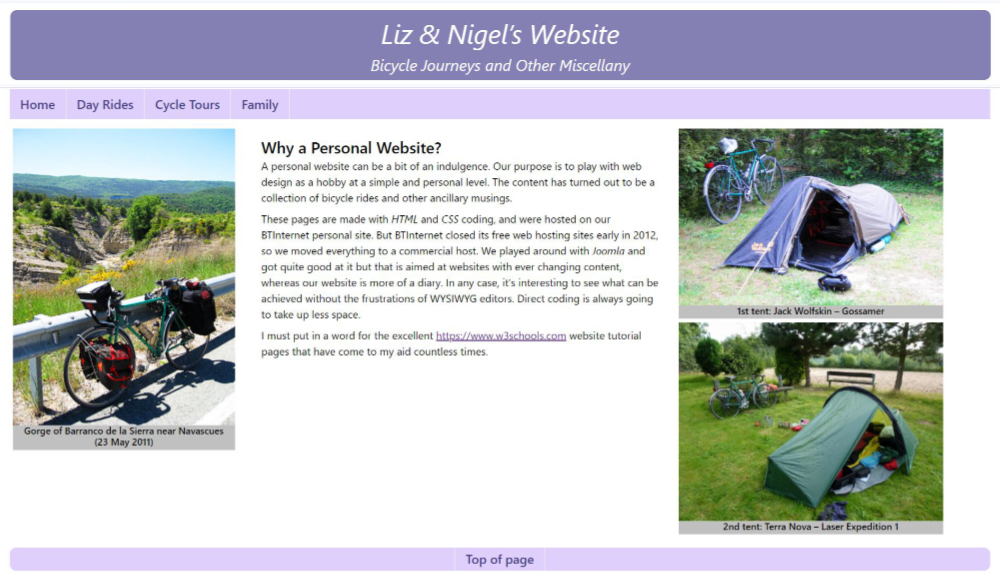 I’d previously worked with Joomla editing my local church’s website and had developed my main site of cycling journeys using basic HTML and CSS, which I still prefer in that it gives you complete freedom provided you know what you’re doing. The downside is that every page has to be edited individually. They have no shared content, so if you alter a menu it has to be changed on every page, and if you have dozens of pages you’re to take some time doing it. That is why on my HTML/CSS site I’ve grouped pages together into subjects and used different menus, so that I only have to edit a few pages if I change anything affecting that group.